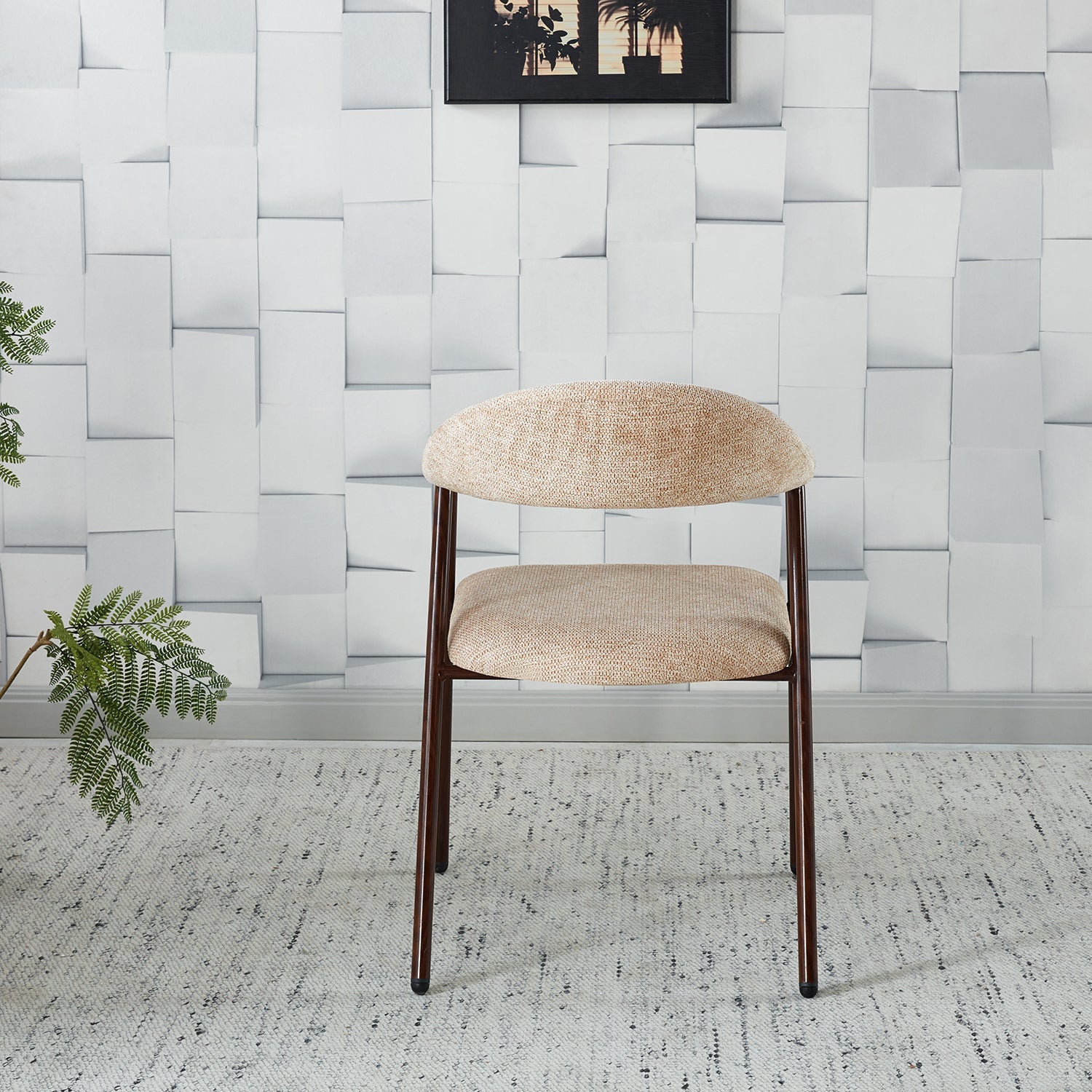 Combine style and comfort with this minimalist Japandi dining chair. The combination of woven fabric and a wood-look base creates a sleek, distinctive appearance that fits any interior. The gently curved backrest provides optimal support during cosy dinners or relaxed moments at the table.